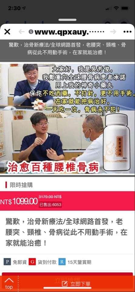 如果還有看到 拜託大家截圖跟複製網址留言或發訊息或發Email(spinewu@gmail.com)給我們 並且踴躍跟FB提出檢舉 因坊間有不肖人士盜用吳芳峻診所及用吳芳峻醫師圖片並假借名義販賣不明藥物,請民眾及病患不要購買、不要聽信謠言,本所已向警察機關報案, 並公開聲明本診所及吳芳峻醫師與此藥物與販賣行為毫無關係, 任何侵害本診所及吳芳峻醫師權益者,將立即報警送辦, 特此聲明。** 這不是診所的廣告 **